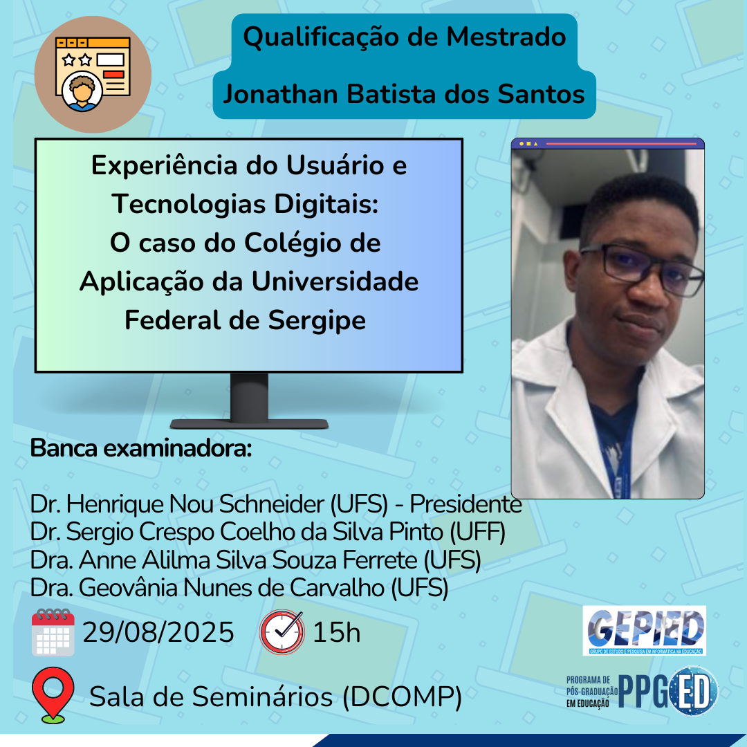 No dia 29/08/25, às 15h, na Sala de Seminários do Departamento de Computação da UFS (São Cristóvão) acontecerá a banca de qualificação de mestrado do gepiediano Jonathan Batista dos Santos, com a pesquisa intitulada “Experiência do Usuário e Tecnologias Digitais: