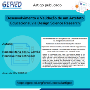 O primeiro artigo, intitulado “Desenvolvimento e Validação de um Artefato Educacional via Design Science Research”, é de autoria de Nadielli Maria dos S. Galvão e Henrique Nou Schneider. O trabalho apresenta a aplicação da metodologia Design Science Research no contexto educacional, evidenciando etapas de desenvolvimento e validação de um artefato educacional.