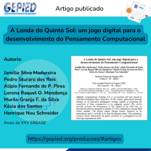 O segundo artigo, “A Lenda do Quinto Sol: um jogo digital para o desenvolvimento do Pensamento Computacional”, foi desenvolvido por Jamille Silva Madureira, Pedro Sturaro dos Reis, Alípio Fernando de Paula Pires, Lorena Raquel Oliveira Mendonça, Murilo Granja Ferreira da Silva, Késia dos Santos e Henrique Nou Schneider. O estudo discute o uso de um jogo digital como estratégia para o desenvolvimento do Pensamento Computacional, articulando aspectos pedagógicos, técnicos e criativos.